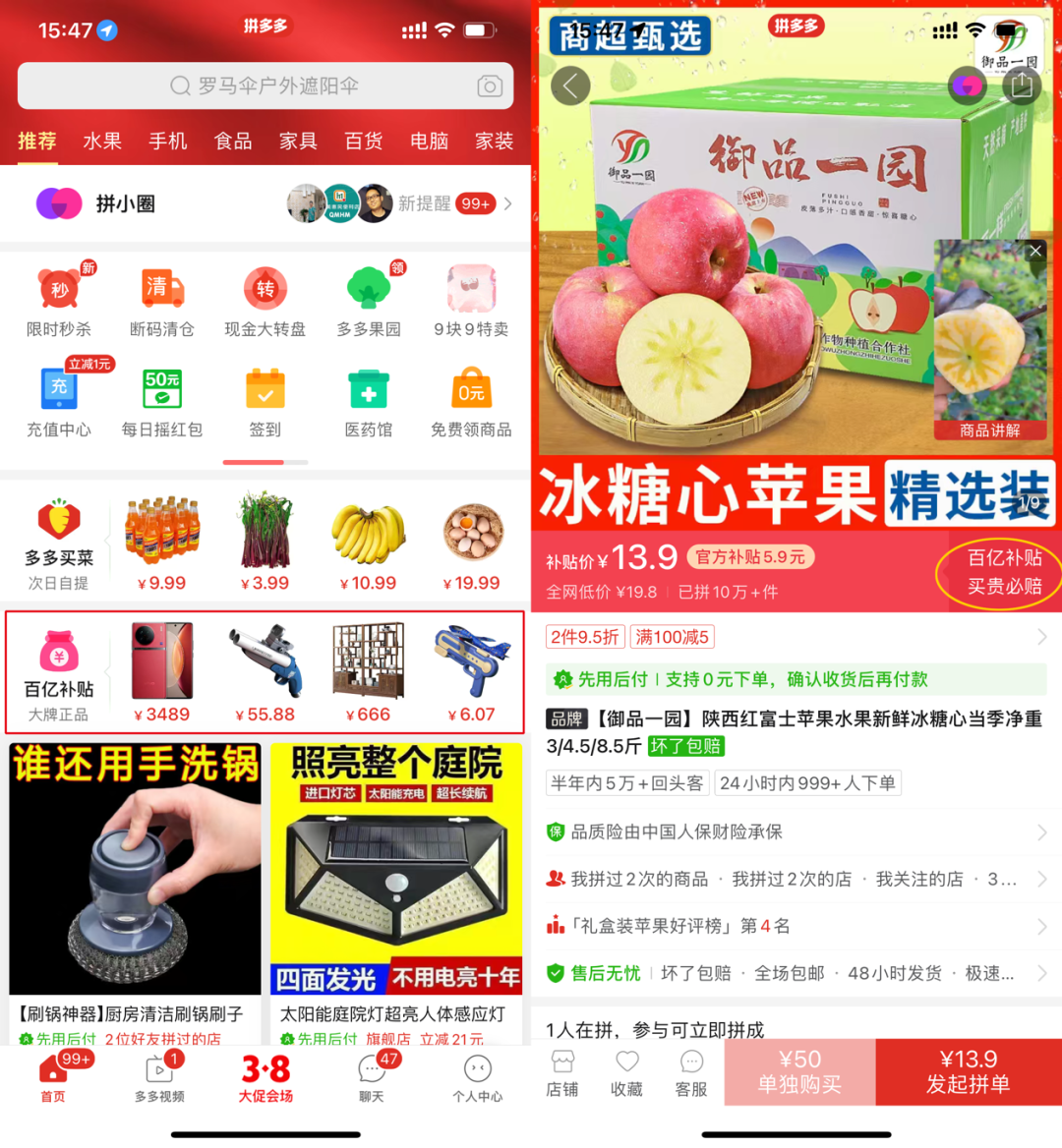 这样一来,百亿补贴作为商品标签就发挥缩小商品范围并进行精准推荐的作用,提高了用户的转化率和复购率。