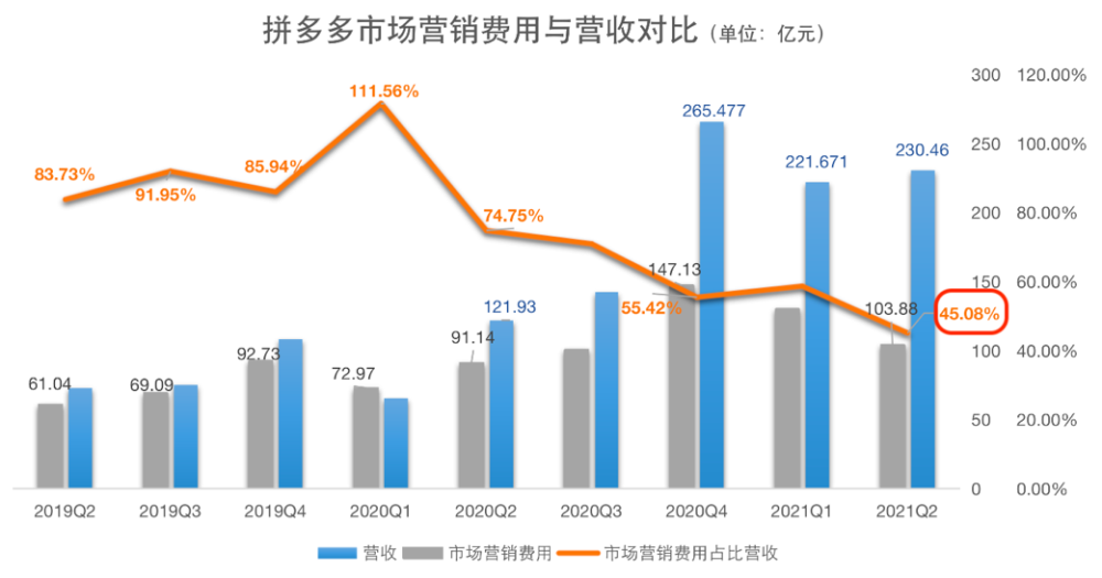从财报数据也可以看出,拼多多在2019年发起百亿补贴之后,市场营销费用在一年内快速上升,之后则持续下降。
