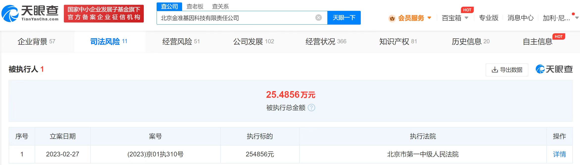 天眼查App显示,近日,北京金准基因科技有限责任公司新增被执行人信息,执行标的25万余元,执行法院为北京市第一中级人民法院。该公司成立于2013年4月,法定代表人为张浩,注册资本1000万人民币,经营范围含医学检验科医疗服务,生物基因检测领域内的技术开发、技术转让、技术推广等,由哈尔滨精准基因科技有限公司全资持股。