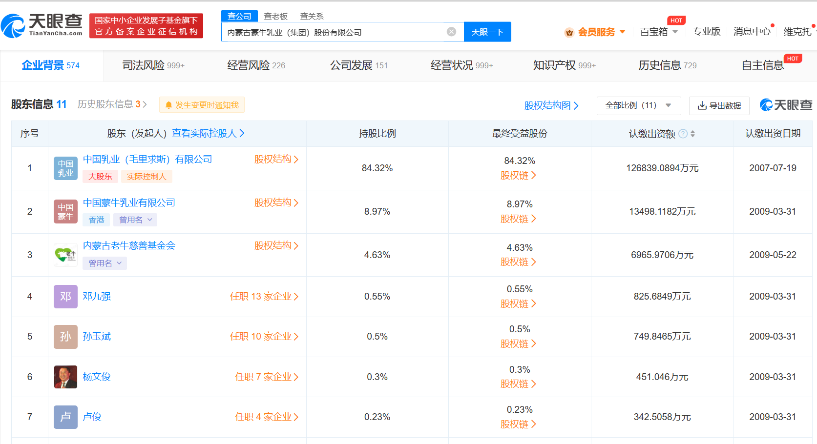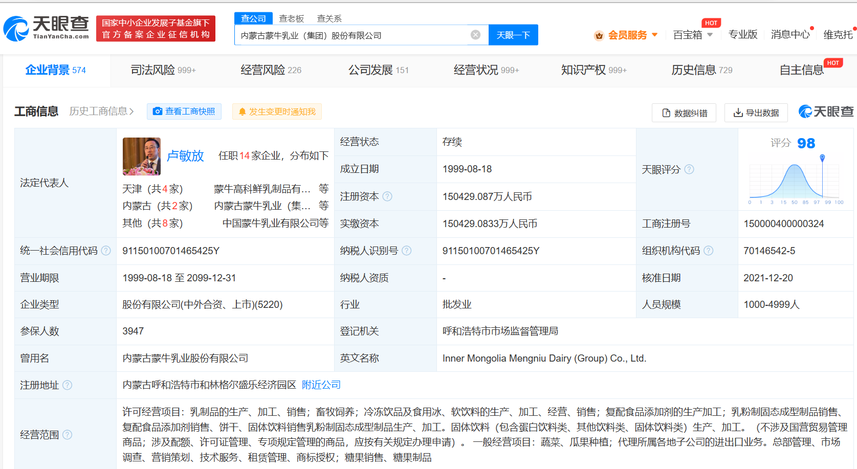 天眼查App显示,近日,内蒙古蒙牛乳业(集团)股份有限公司新增一则被执行人信息,执行标的214万余元,执行法院为和林格尔县人民法院。