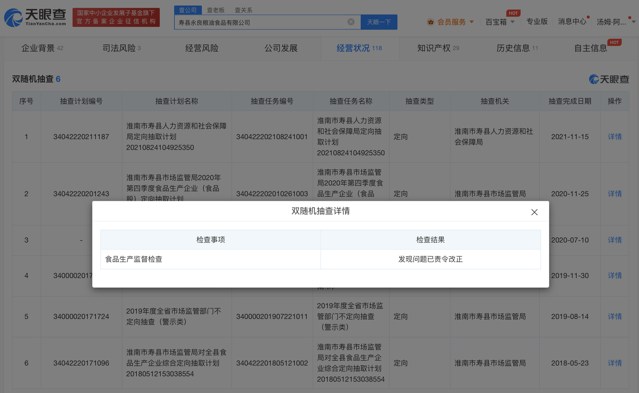 天眼查App显示,寿县永良粮油食品有限公司成立于2009年11月,法定代表人为刘录忠,注册资本270万人民币,经营范围包括大米生产、销售,粮食收购、销售,油菜籽收购、销售等,由刘录亮、刘录忠、刘健共同持股。双随机抽查显示,该公司曾在食品生产监督检查项目中被发现问题并责令改正。此外,该公司已申请注册“泰子王”等商标。