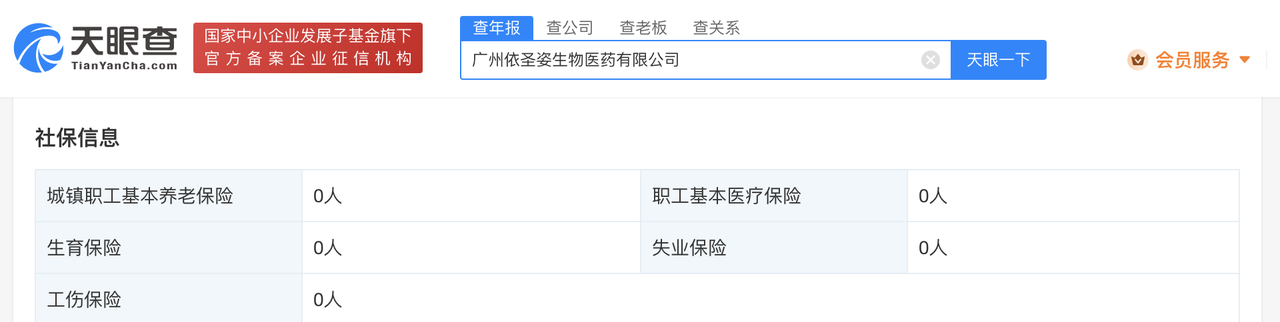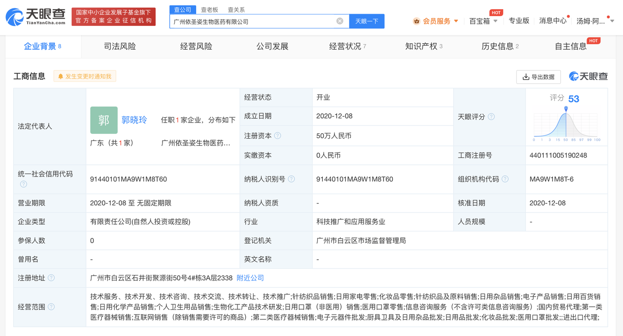 天眼查App显示,依圣姿生物医药有限公司成立于2020年12月,法定代表人为郭晓玲,注册资本50万人民币,经营范围包括日用化学产品销售;个人卫生用品销售;生物化工产品技术研发等。年报信息显示,该公司2021年参保人数为0。