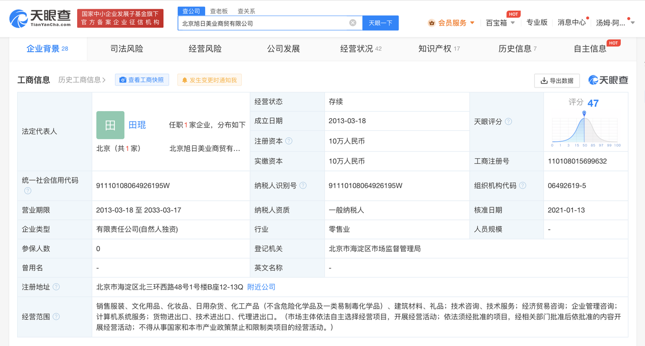 北京旭日美业商贸有限公司成立于2013年3月,法定代表人为田琨,注册资本10万人民币,经营范围包括销售服装、文化用品、化妆品、日用杂货、化工产品等。年报信息显示,该公司2021年参保人数为0。10111213