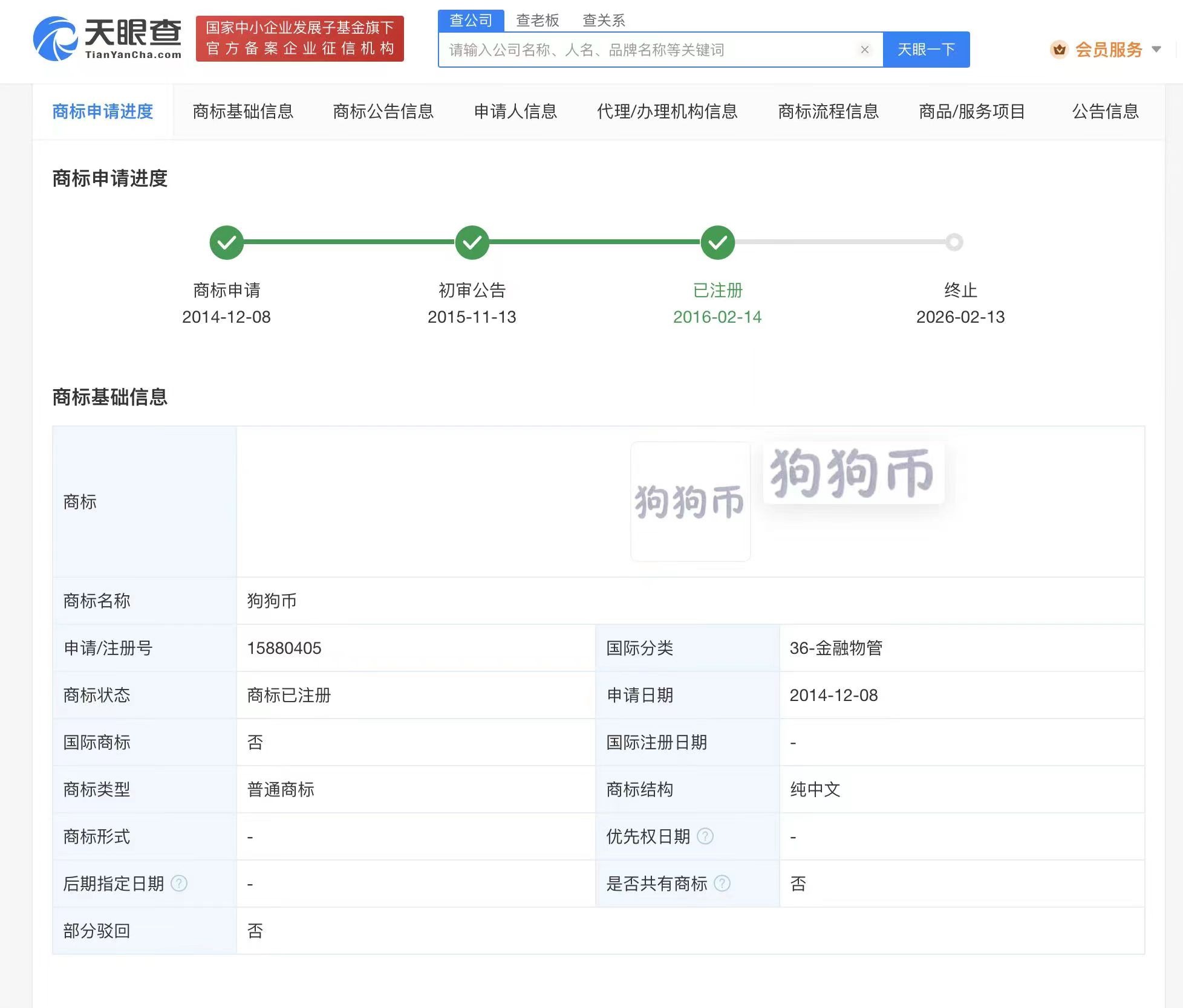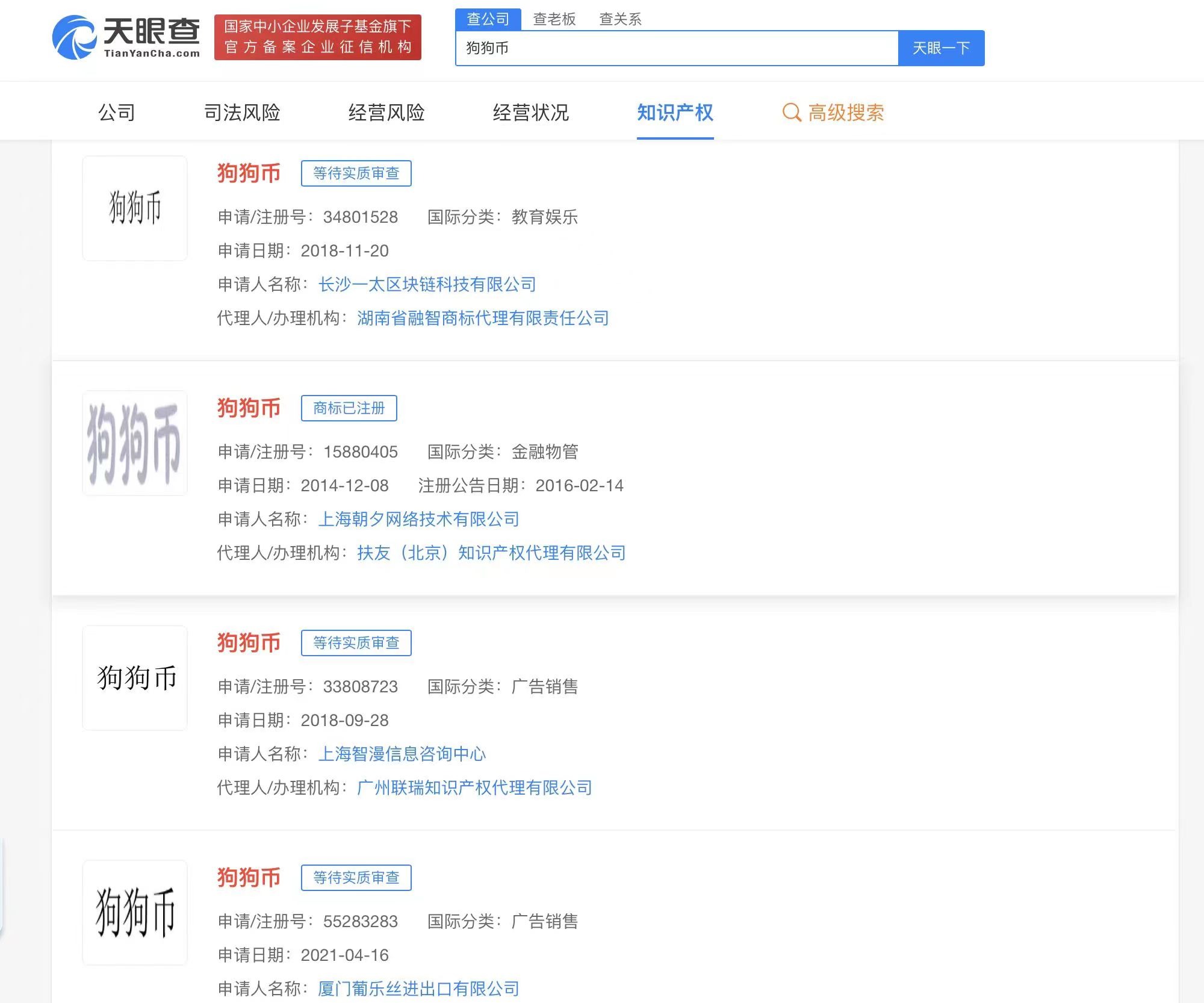 天眼查App显示,“狗狗币”商标已被上海一网络技术公司成功注册,国际分类为金融物管。另外,还有进出口公司、农业开发公司、投资公司等申请“狗狗币”“狗狗币 DOGS COIN”商标,目前商标状态多为等待实质审查、驳回复审。