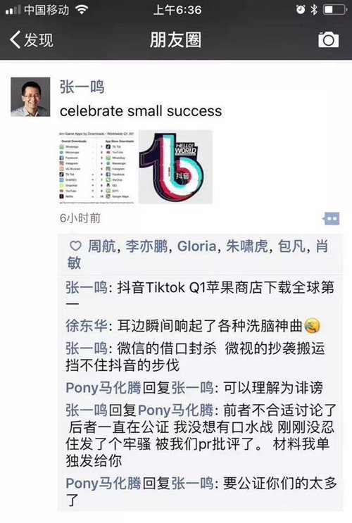 腾讯与字节跳动的大规模冲突始于2018年,已打了5年之久,且没有停战的迹象。期间,双方大打口水战、诉讼战,完全互不相让,甚至连各自一把手也亲自下场互怼。2018年5月,张一鸣在朋友圈庆祝抖音海外版登顶一季度App Store下载榜榜首,还留言称,“微信的借口封杀,微视的抄袭搬运,挡不住抖音的步伐。”