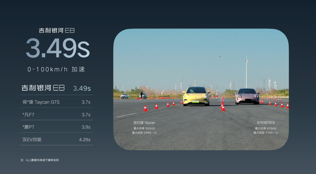 在此基础上,银河E8通过吉利独有的、国内首创的数字化虚拟调校,调校迭代超过1万次,横摆线性度做到92.61%,远远超过行业平均水平81%,在最能验证操稳性能的麋鹿测试中,银河E8做到了82km/h的好成绩,全球排名前三,超越了保时捷911和Taycan。