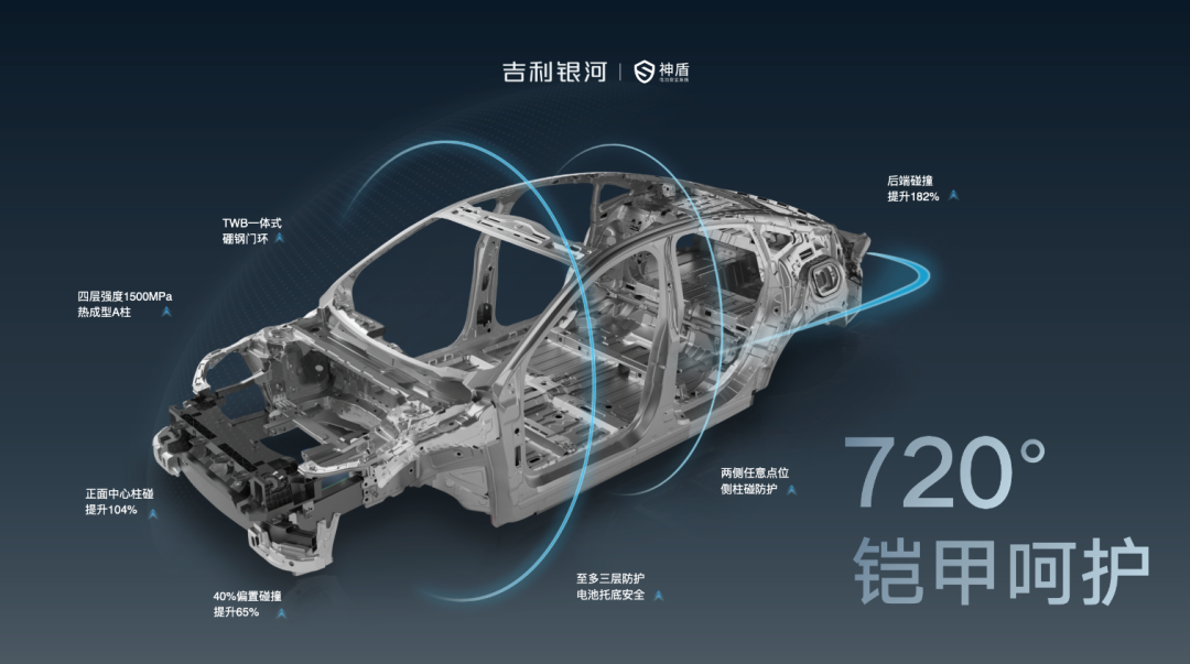 在吉利看来,“安全”没有豪华和主流之分,吉利银河专属的“神盾电池安全系统”,创造了一整套从电池到架构、整车、智控、云端的四层“无盲区”安全防护系统。