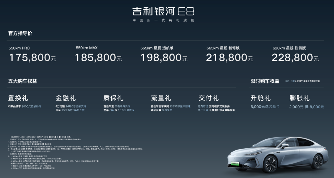 1月5日,“中国新一代纯电旗舰”银河E8正式上市并同步开启交付。新车共推出5个版型,售价区间17.58万元-22.88万元。同时,吉利银河E8还推出了一系列限时购车权益,涵盖订车、购车、用车全维度。东方甄选董事长兼CEO俞敏洪,成为吉利银河E8首位车主。