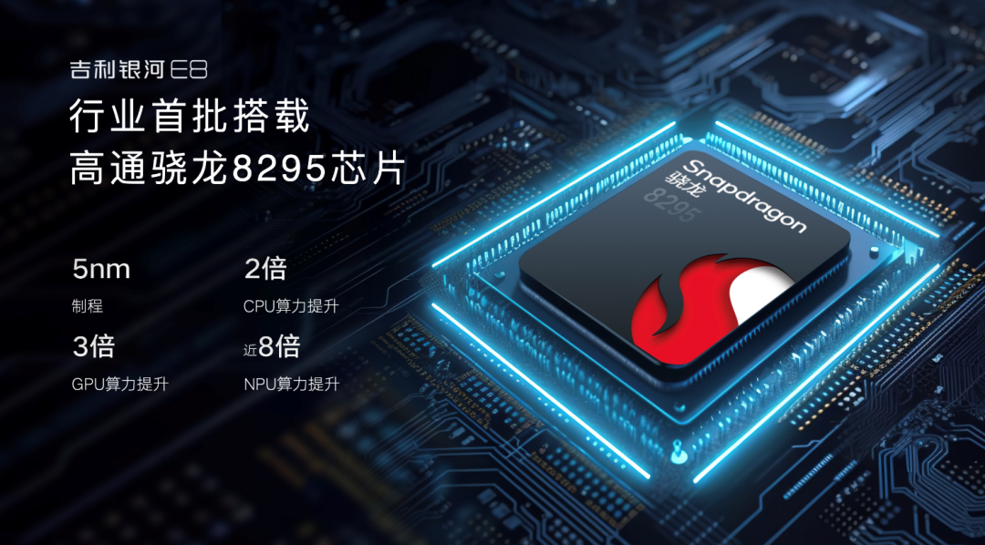 与大屏相匹配的是最强算力最强的高通骁龙8295芯片,采用更先进的5Nm制程,较8155芯片提升8倍算力。银河E8还配备了有趣的灵魂——银河NOS无界版车机系统,并配备了两个超级大脑:Flyme Link手机域+魅族手机带来的“超级手机大脑”,以及吉利星睿智算中心赋能的“超级云端大脑”。