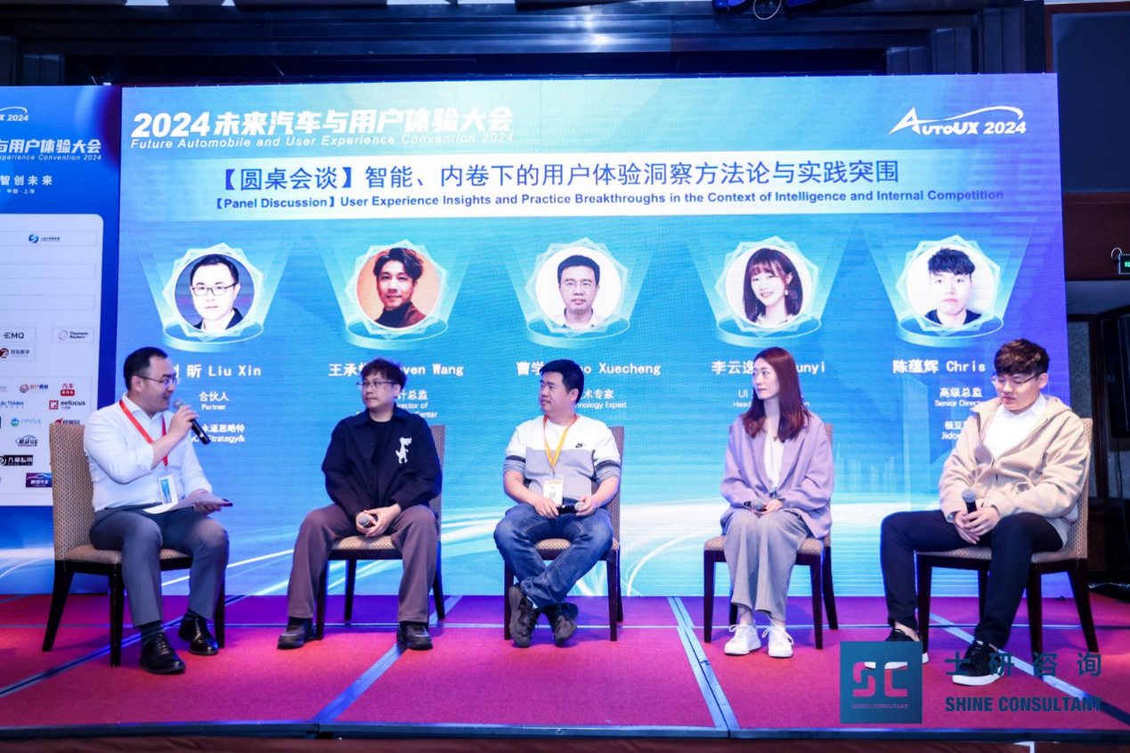 第一天会议的最后,由普华永道思略特合伙人刘昕作为主持,小鹏汽车数据智能中心设计总监王承炀、路特斯科技资深技术专家曹学成、上汽大众UI交互负责人李云逸以及极豆科技高级总监陈蕴辉作为讨论嘉宾,围绕“智能、内卷下的用户体验洞察方法论与实践突围”主题展开了激烈讨论。