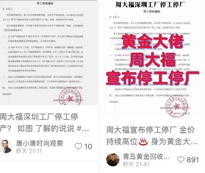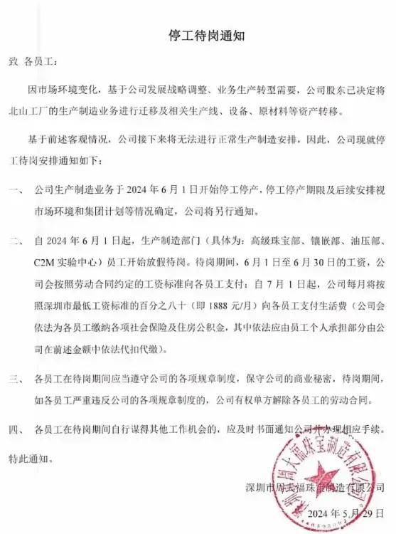 即有疑似周大福发布了一份停工待岗的通知,通知显示,基于环境变化、战略调整等客观情况,公司接下来将无法进行正常的生产制造暗盘,公司制造业务决定6月七日开始停工停产。