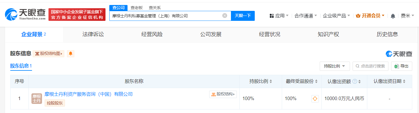 天眼查App显示,近日,摩根士丹利私募基金管理(上海)有限公司成立,法定代表人为孙恂,注册资本1亿人民币,经营范围含私募股权投资基金管理、创业投资基金管理服务。股东信息显示,该公司由摩根士丹利资产服务咨询(中国)有限公司全资持股。