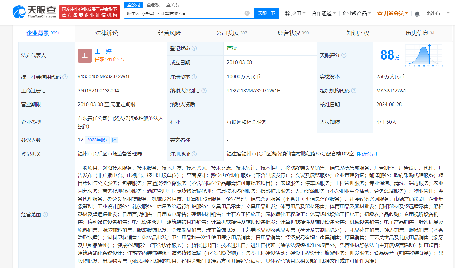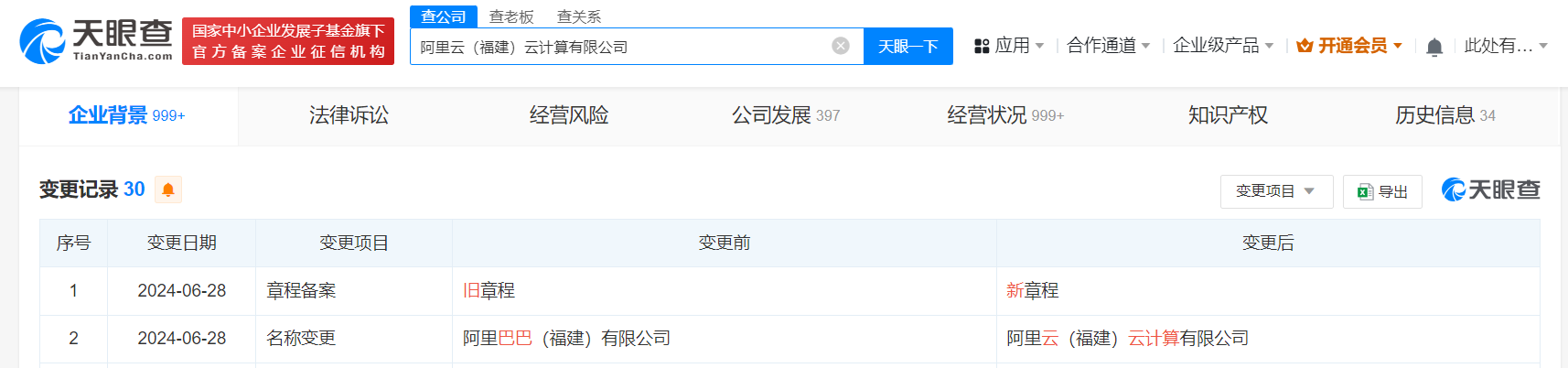 天眼查App显示,近日,阿里巴巴(福建)有限公司发生工商变更,企业名称变更为阿里云(福建)云计算有限公司。