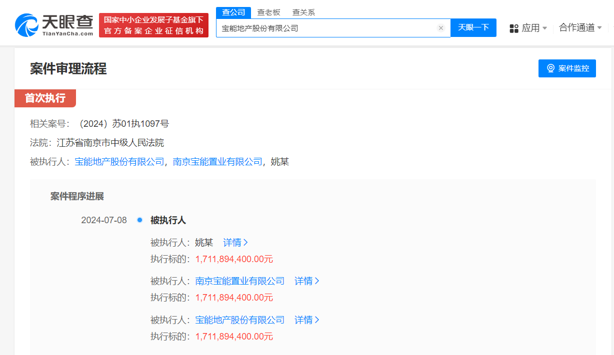 天眼查法律诉讼信息显示,近日,姚振华、宝能地产股份有限公司、南京宝能置业有限公司新增一条被执行人信息,执行标的17.1亿余元,执行法院为江苏省南京市中级人民法院。