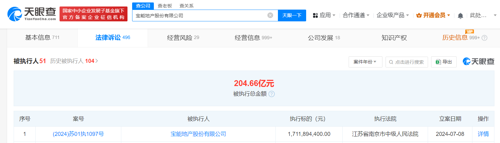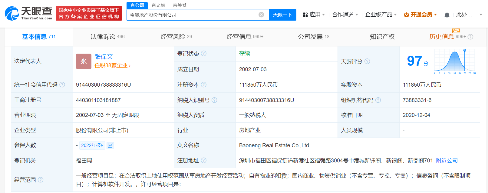 宝能地产股份有限公司成立于2002年7月,法定代表人为张保文,注册资本约11.2亿人民币,由宝能控股(中国)有限公司、深圳市中林实业发展有限公司共同持股。风险信息显示,该公司目前存在51条被执行人信息,被执行总金额超204亿元,此外还存在多条限制消费令、失信被执行人(老赖)和终本案件信息。