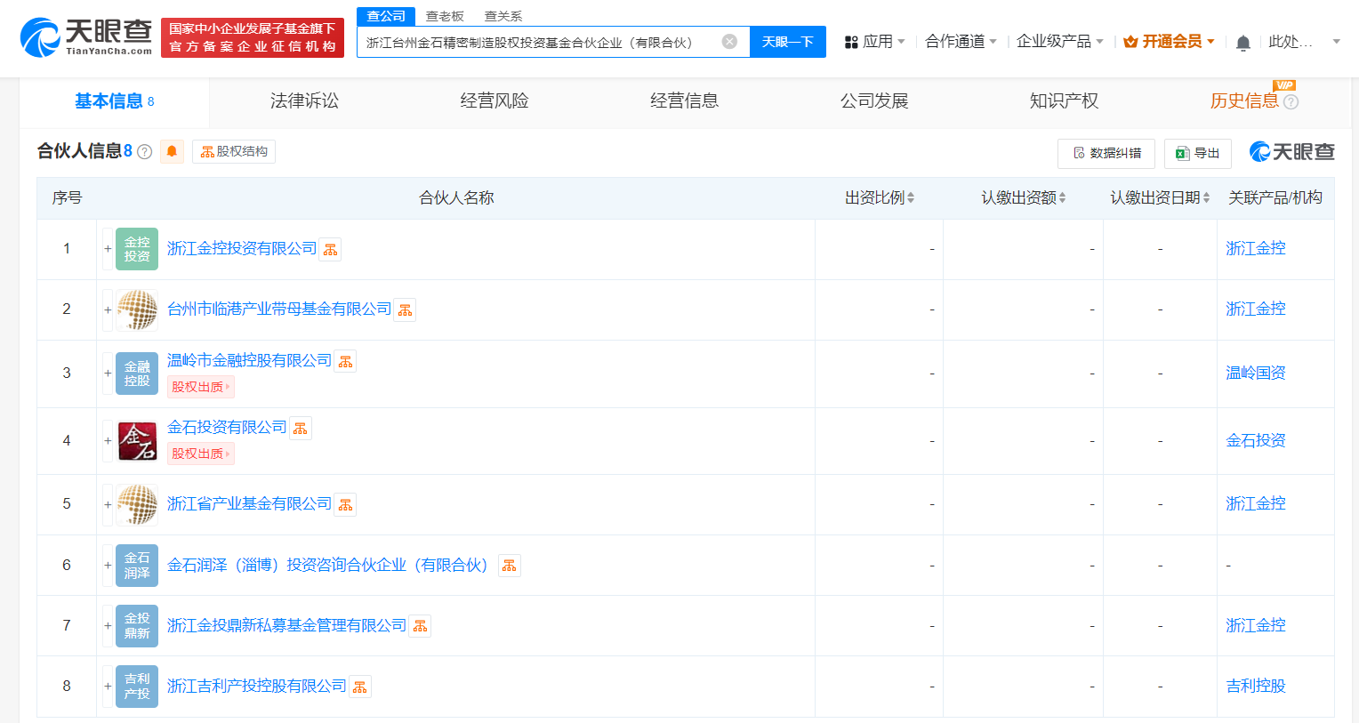 天眼查App显示,近日,浙江台州金石精密制造股权投资基金合伙企业(有限合伙)成立,执行事务合伙人为金石投资有限公司,出资额50亿人民币,经营范围为股权投资。合伙人信息显示,该基金由浙江金控投资有限公司、台州市临港产业带母基金有限公司、金石投资有限公司、浙江省产业基金有限公司、浙江吉利产投控股有限公司等8位合伙人共同出资。