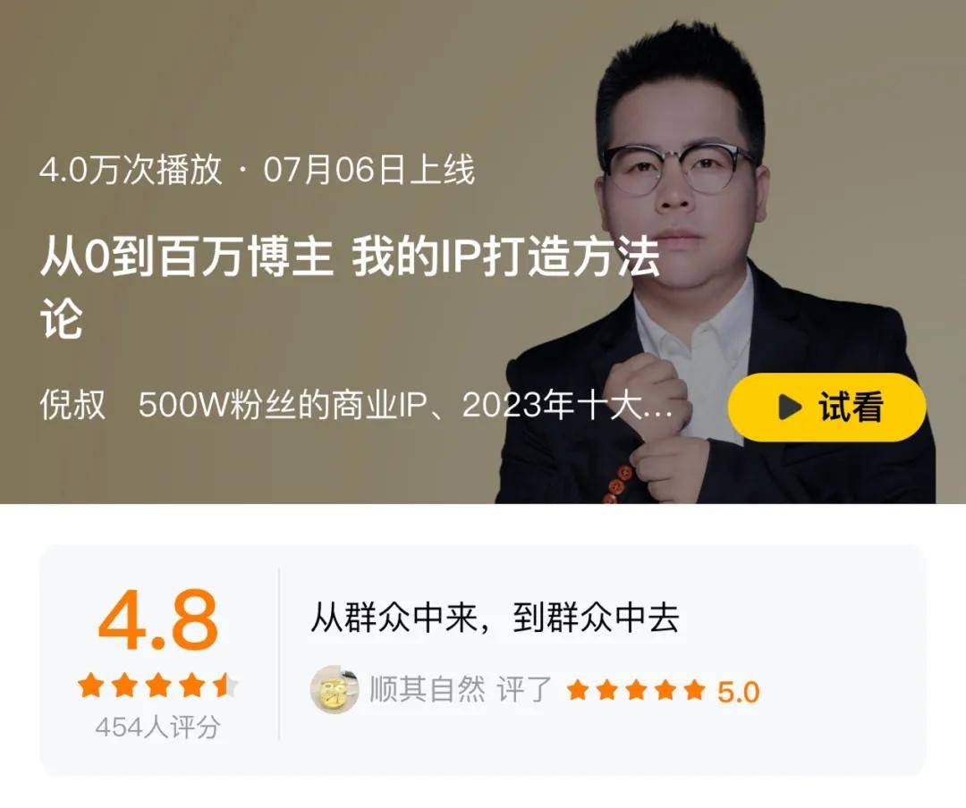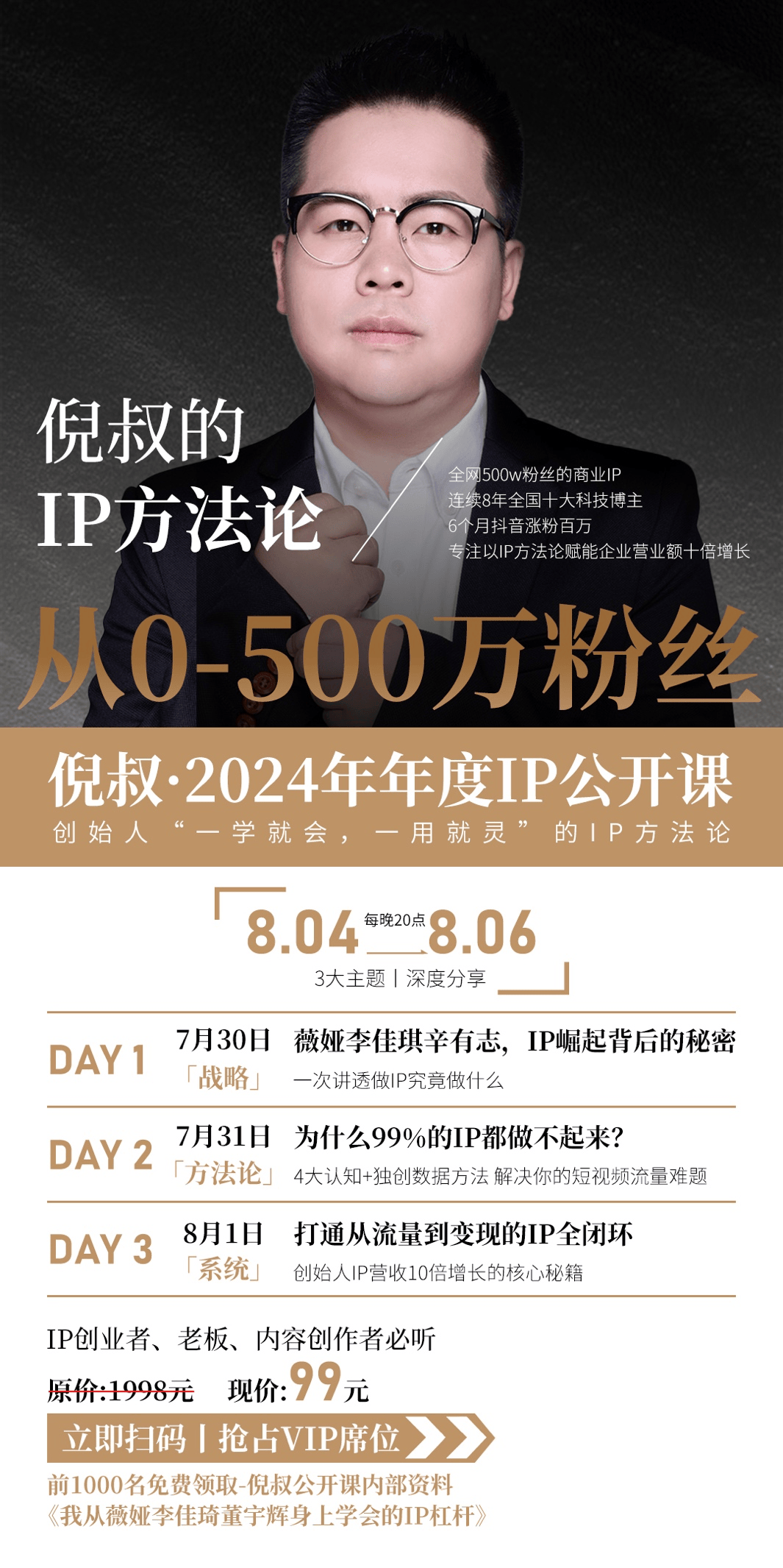 这样的案例太多,不便一一列举。如果你想建立自己的创始人IP,快速完成从0到1,解决:跑通流量+变现+持续性的三大问题,欢迎扫码加入我的3天「从0到500w粉丝,倪叔的IP方法论·公开课」