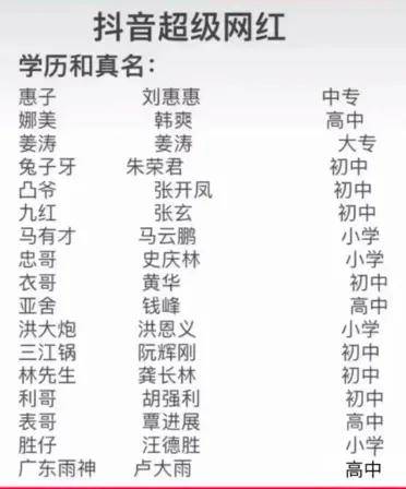 这是一张在网上流传已久的图片,这上面的每一个名字:今天都是大网红,但他们昨天都是一个没有上过大学的普通人。