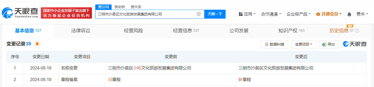 天眼查App显示,近日,三明市沙县区小吃文化旅游发展集团有限公司发生工商变更,企业名称变更为三明市沙县区文化旅游发展集团有限公司。