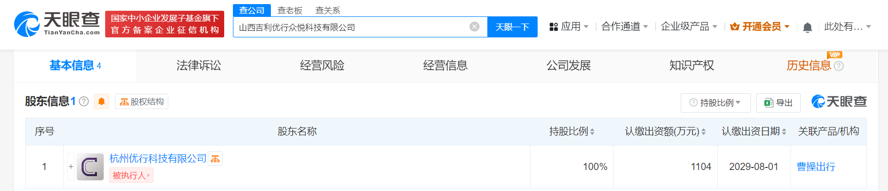 天眼查App显示,近日,山西吉利优行众悦科技有限公司成立,法定代表人为郑琦,注册资本1104万人民币,经营范围含网络预约出租汽车经营服务、道路旅客运输经营、人工智能应用软件开发、网络与信息安全软件开发、小微型客车租赁经营服务、汽车零配件批发、汽车销售等。股东信息显示,该公司由曹操出行关联公司杭州优行科技有限公司全资持股,后者由吉利旗下浙江济底科技有限公司控股。