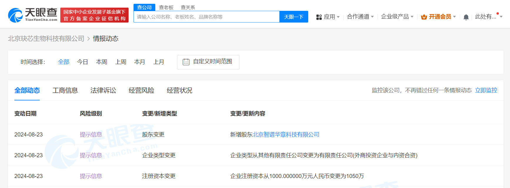 天眼查App显示,近日,北京玦芯生物科技有限公司发生工商变更,新增智谱AI关联公司北京智谱华章科技有限公司为股东,同时,注册资本由1000万人民币增至1050万人民币。