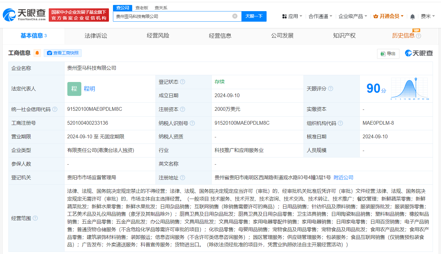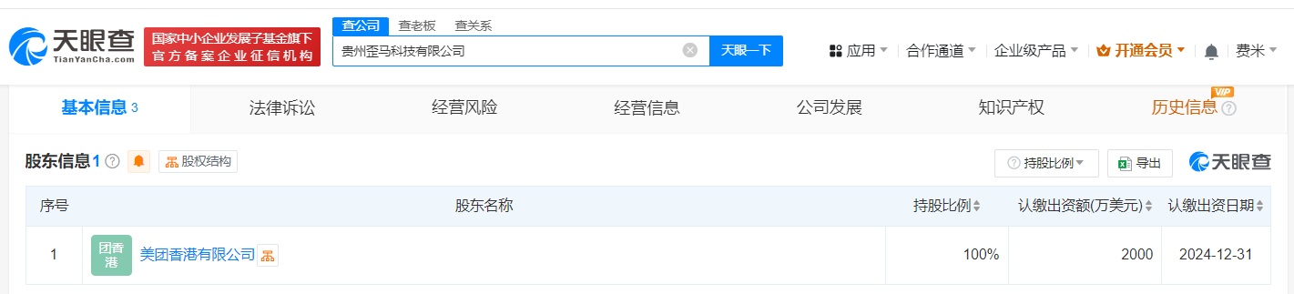 天眼查App显示,近日,贵州歪马科技有限公司成立,法定代表人为程明,注册资本2000万美元,经营范围含餐饮管理、新鲜蔬菜零售、日用杂品销售、互联网销售、供应链管理服务等。股东信息显示,该公司由美团香港有限公司全资持股。