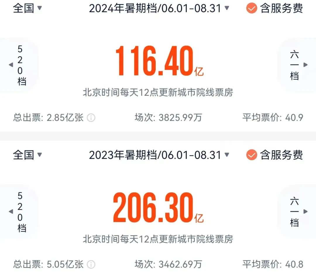灯塔数据显示,2024年暑期档票房为116.4亿元,比2014年暑期档112亿元的票房略高,但与去年暑期档206.3亿元的票房成绩相比,几乎腰斩。今年暑期档,票房过10亿的电影仅有《抓娃娃》和《默杀》,多部被寄予厚望的类型片哑火,导致电影市场大盘收缩严重。