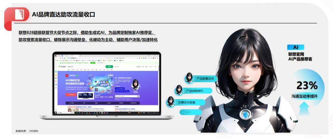 二是针对企业营销服务同样进行了AI化升级。例如融合了传统搜索广告样式与生成式AI技术的360AI品直,在品牌大促等关键节点上,为其定制专属的AI推荐官,为传统的搜索广告样式注新的生命力,化被动为主动的沟通形式,破除沟通壁垒,数字人美少女种草效率自然更高。内部人士反馈,以3C数码为主的科技行业对AI品直青睐有加。