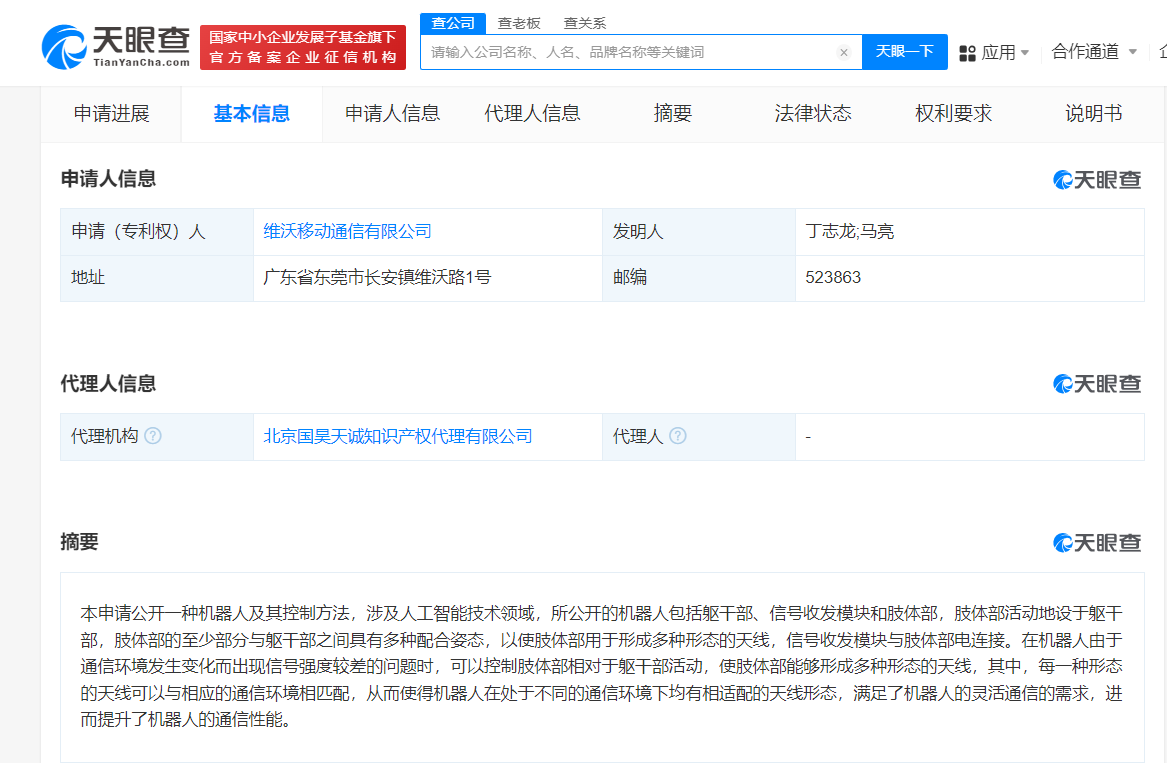 天眼查知识产权信息显示,近日,维沃移动通信有限公司申请的“机器人及其控制方法”专利公布。