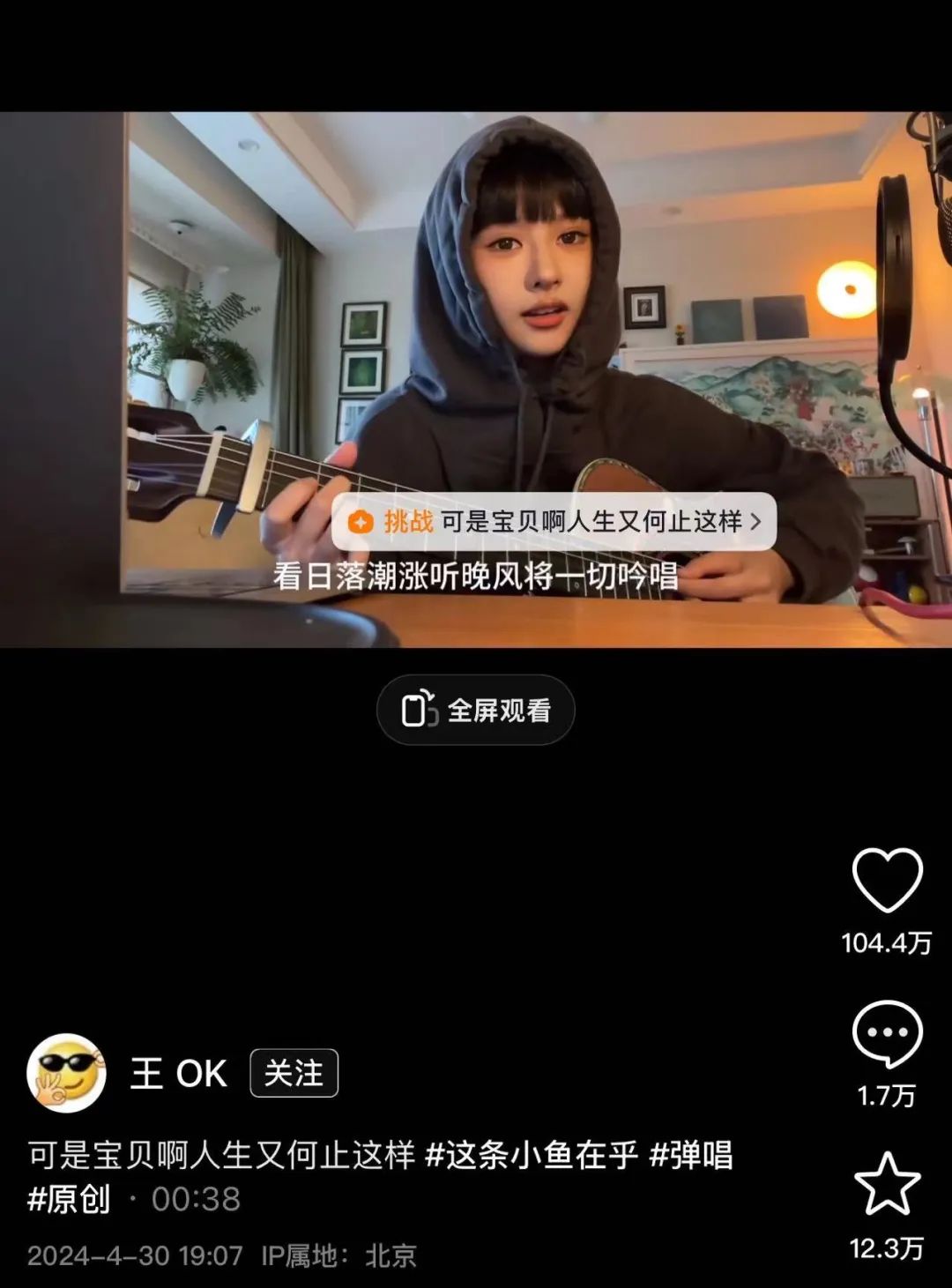 今年4月一句“可是宝贝啊人生又何止这样”成了不少人深夜难过时的安慰,这个边弹边唱的短视频在抖音上收获104.3万赞12.3万收藏,让王OK在今年成功破圈。如朋友般轻声安慰的居家弹唱画面击中了听众,引发抖音用户留下自己的感受,“这首歌好像一个拥抱,边唱边拥抱哭气得我说没关系”。
