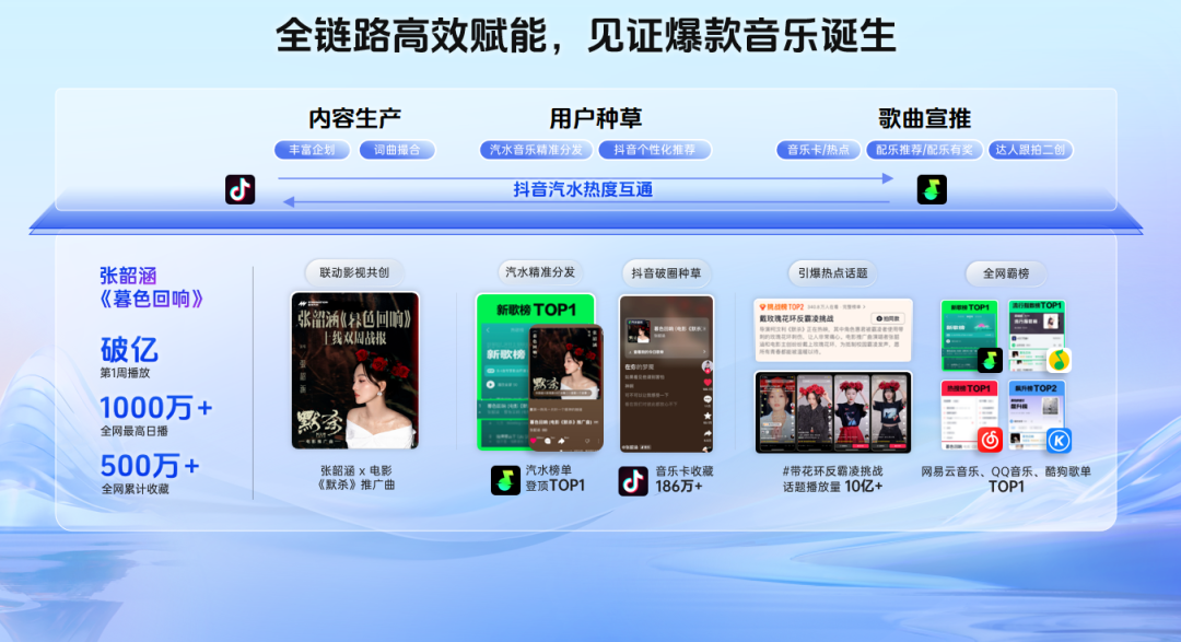 抖音提到了平台确认潜力歌曲的底层逻辑——依据用户爱听、用户创作爱用两个场景找到好歌。像是单依纯新歌《纯妹妹》通过抖音音乐卡产品,7日内触达单依纯4成粉丝,播放量破2.8亿,足以验证《纯妹妹》在市场的传播潜力。