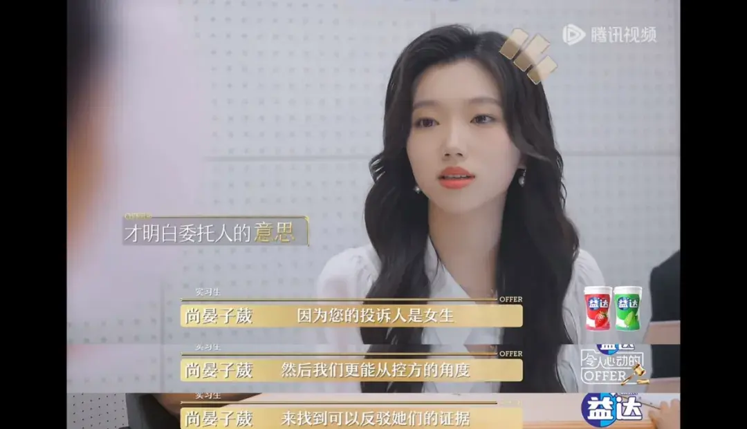 在《令人心动的offer6》新一期的节目中,尚晏子葳安抚好模拟课题当事人的情绪,准备进一步聊天获取有效信息时,却被质疑女律师没有男律师靠谱。