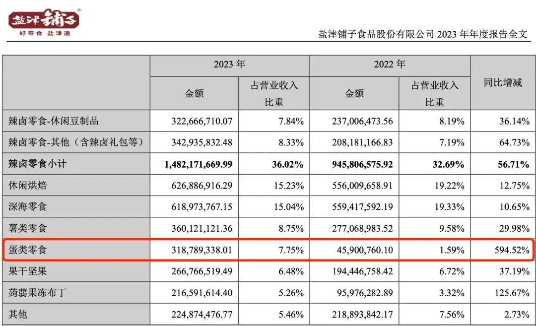 中国零食品类不仅丰富,而且每一个品类都有机会做出极大的份额,最典型的就是卫龙,在辣条这个细分市场做出近50亿的年销售额。盐津铺子的「蛋皇」也是一个典型,其2023年财报显示,蛋类零食收入3.1亿,同比增长594.52%,营收占比也从1.59%到7.75%。
