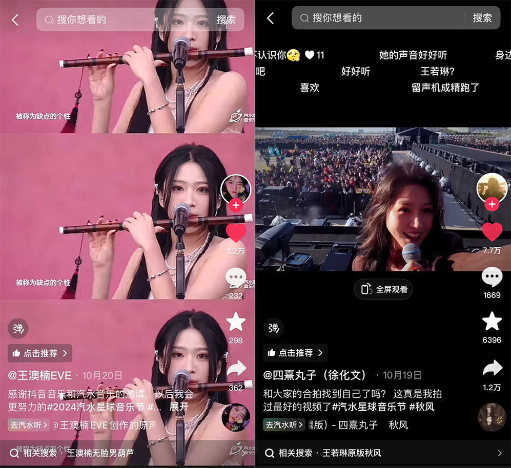 例如,近期举办的汽水星球音乐节-青岛站上,抖音就邀请了王澳楠、迷心乐队、四熹丸子等3组音乐人登台。同时,@汽水星球音乐节、@抖音美好现场等官方账号发布的音乐人演出视频也获得了不错的二次传播。