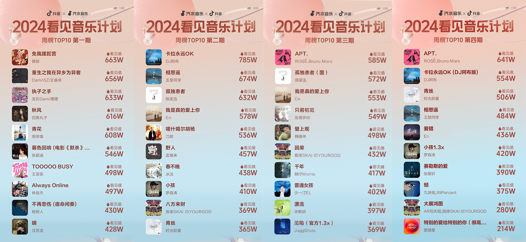 不同于某个平台的榜单,基于抖音庞大的日活用户,「2024汽水音乐&抖音看见音乐计划」周榜的最大优势便是能获取到最完整、最真实的听歌数据。