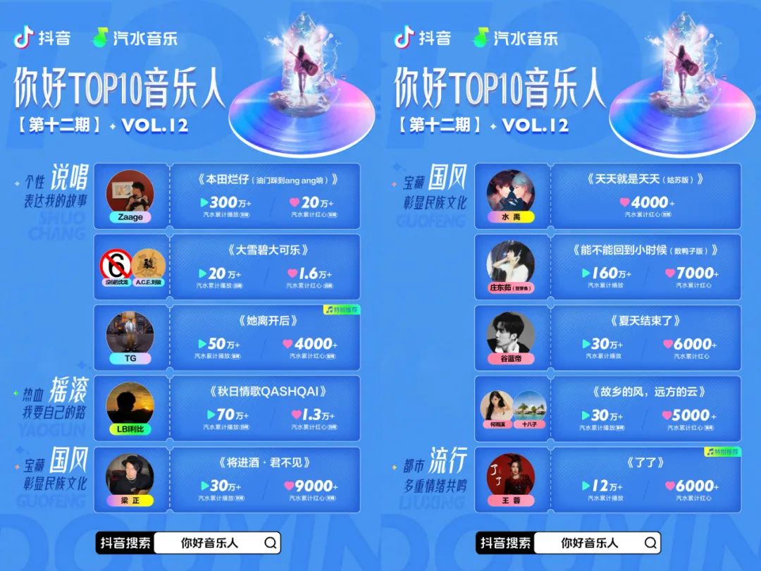 如果说根据“看见值”排名得出的2024「汽水音乐&抖音看见音乐计划」周榜反映了大众审美下的华语乐坛的主流一面,那么,近期同步揭晓的抖音「你好,音乐人」第十二期双周TOP10音乐人榜单,则给我们呈现了华语乐坛生猛活力的另一面。