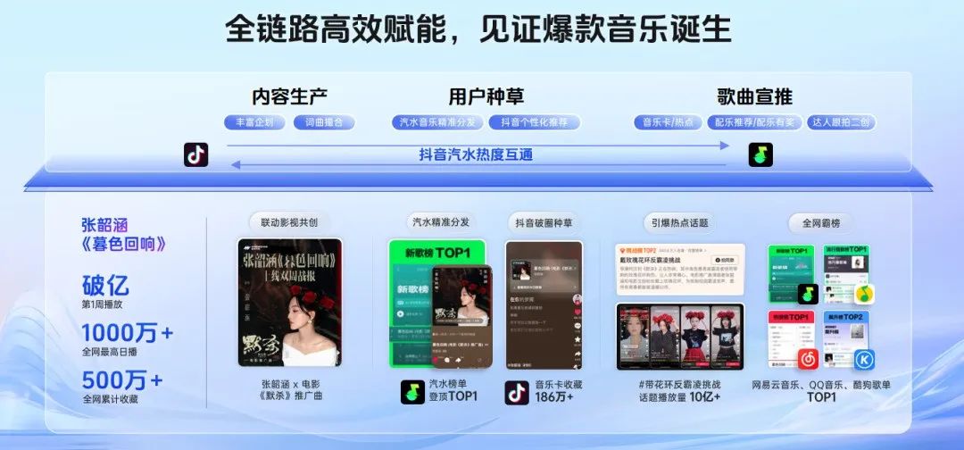 以张韶涵演唱的《暮色回响》为例。作为电影《默杀》推广曲发布后,看见音乐计划会为新歌提供专属宣推资源,通过抖音、汽水音乐双端流量推荐、核心曝光位等方式(如音乐卡、配乐有奖征稿),强力助推新歌冷启;同时,在抖音站内联动影片主演及张韶涵共同发起#带花环反霸凌挑战,吸引了众多头部达人参与,首周播放量便成功破亿,并登上第一期周榜第6位,话题播放量超80亿,全链路高效赋能音乐宣推,助力歌曲成功破圈。