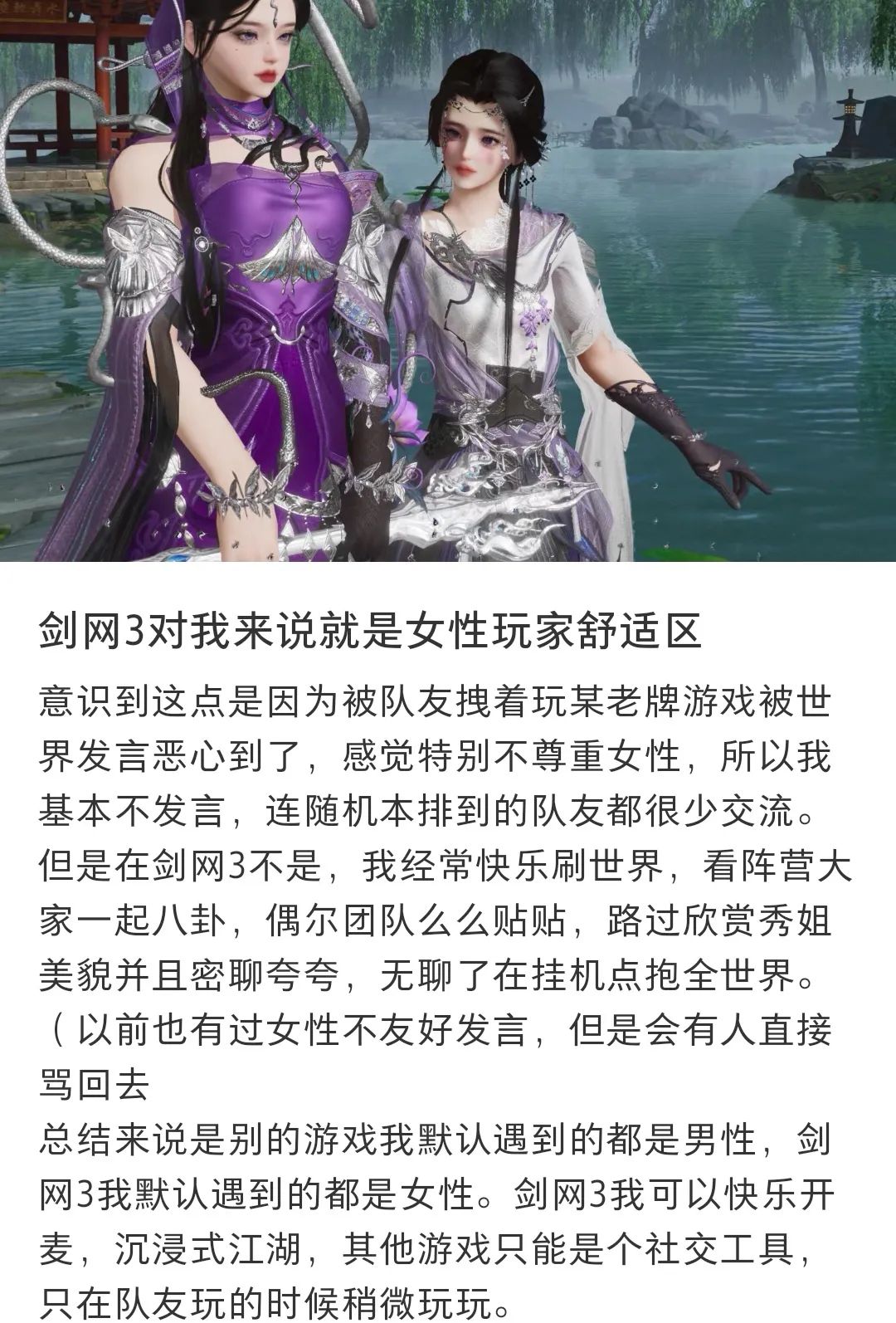 比如网游《剑网三》女性玩家便曾掀起过一场反制游戏团队的起义,她们以占据游戏流水颇高的比例为底气,加之强烈的舆论攻击性措施,令游戏厂商不得不取消设计上架充满性暗示的女NPC服装,并成功将这未能端平一碗水的一般向游戏推行至类女性向。在女玩家的抗议下,《剑网三》游戏环境也明显区别于其他,“优男玩家一起当姐妹,恶臭男被喷八百楼”。