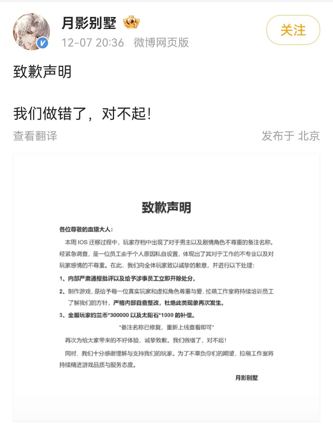 12月7日,有玩家发现乙游《月影别墅》进行iOS迁移后,游戏界面惊现男主备注“版本2110”、“你妈鼻”,一位女NPC也被称为“女表”。而在玩家多日发声维权后,官方才姗姗来迟发布了道歉声明,表示“涉事员工性别男、年龄4x岁、隶属测试部门,此为其因个人原因私自设置”,该名员工也被给予立即开除处分。
