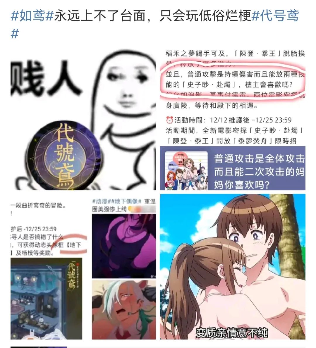 并且,同期宣布的密探角色“史子眇”新皮肤抽卡活动,也被指出皮肤介绍——“普通攻击是持续伤害而且能放两种技能的史子眇·赴烛,楼主会喜欢吗”,来自于意淫母亲乱伦、卖肉的R18宅男向轻小说、动漫《普通攻击是全体二连击,这样的妈妈你喜欢吗?》的二创;而“史子眇”在《代号鸢》中也因职能为恢复血条、温柔且具有无条件保护、治愈、养育广陵王长大的“奶妈”形象,被玩家看作为值得尊重的“男妈妈”。