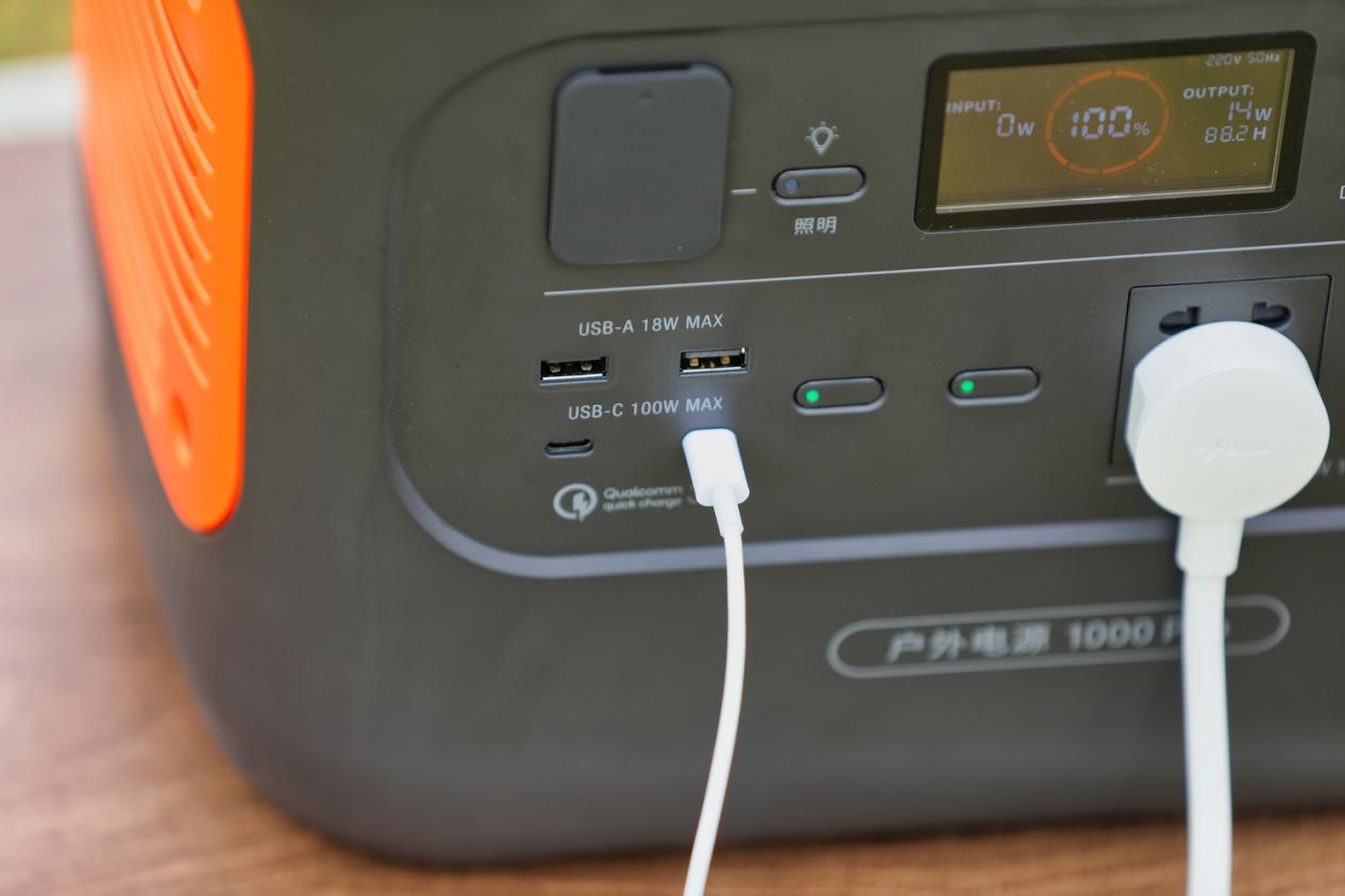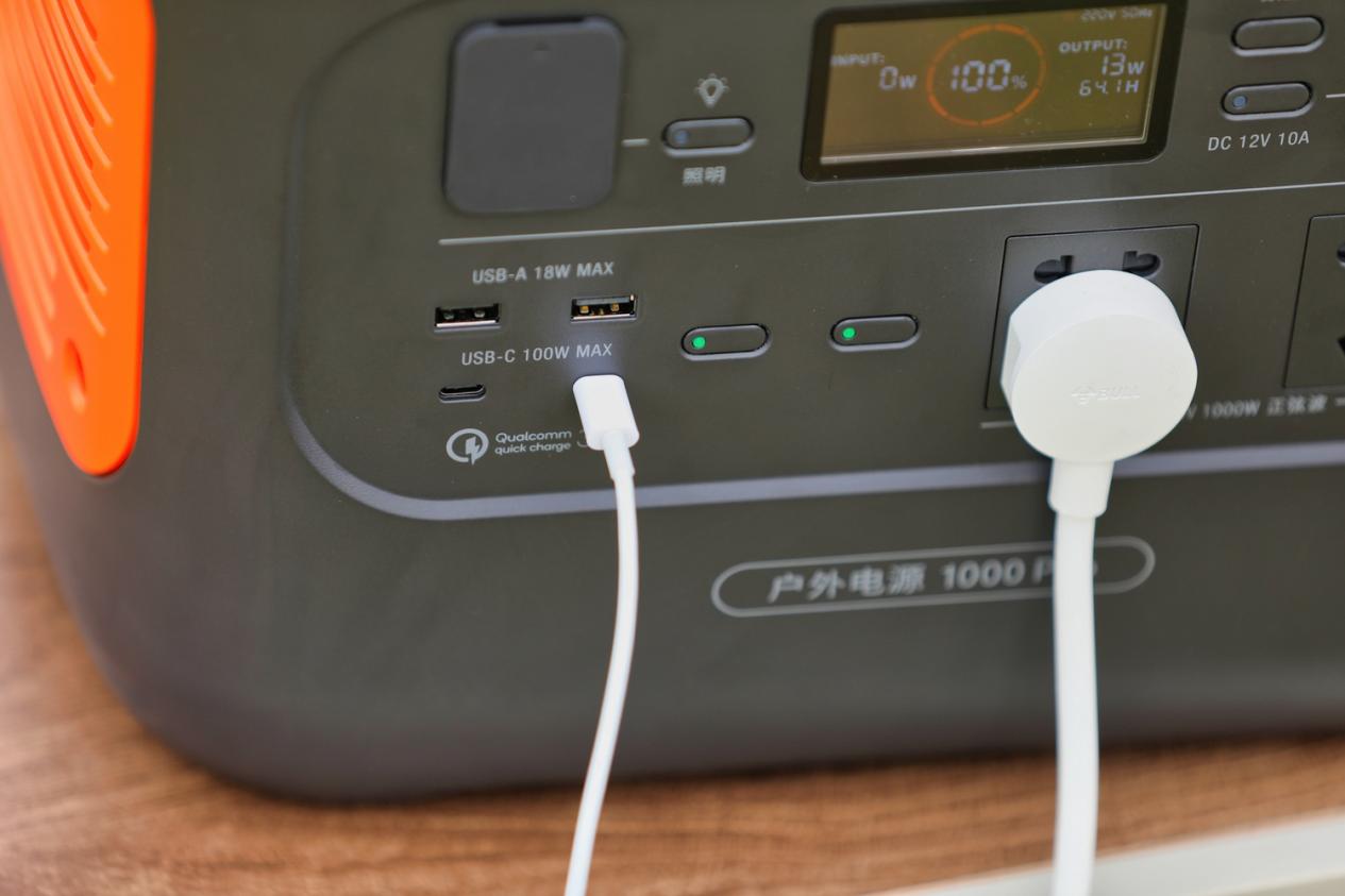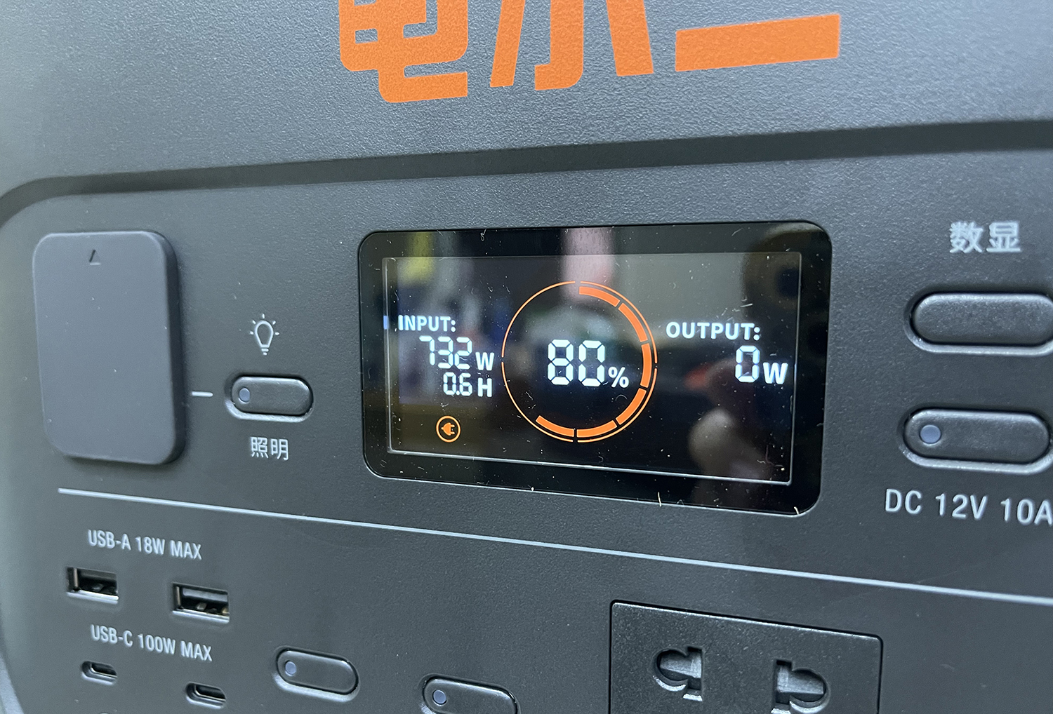 在家里直接使用官方标配的AC电源线连接插座与户外电源上的AC输入接口即可。在充电效率上也大大提升了,官方称最大充电效率可以达到800W,也就是说同样是1002Wh的容量,1000Pro版本最快可1.8小时就可以充满了。根据我们在实际测试过程中,市电充电功率稳定在可732W左右,30%左右的电量,耗时1.2个小时充满100%,与官方数据基本吻合。