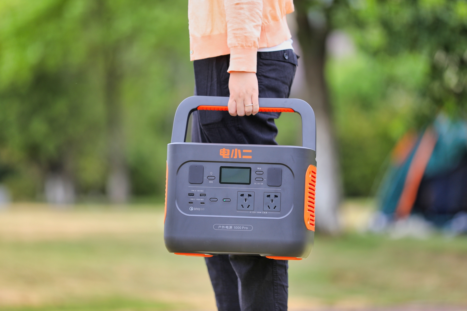 电小二1000Pro整体重量为22斤左右,这样一款偏轻量级的户外电源,对一个男生而言提着去露营是不会太吃力,对女生来说短距离提着也没啥大问题。
