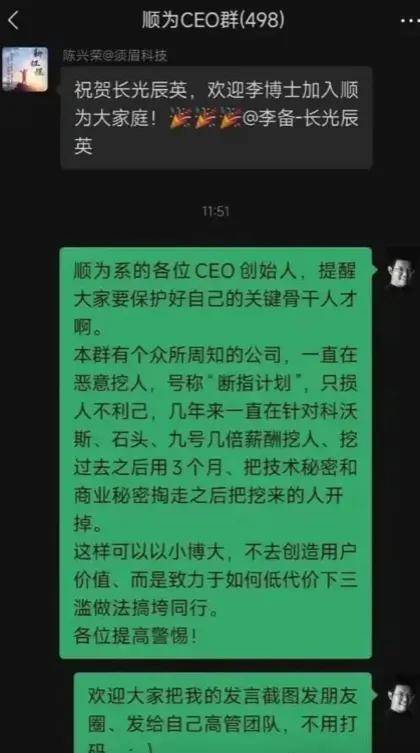 即在一个名为「顺为CEO群」的微信群内,有人发言表示:顺为系的各位CEO创始人,提醒大家保护好自己的关键骨干人才。