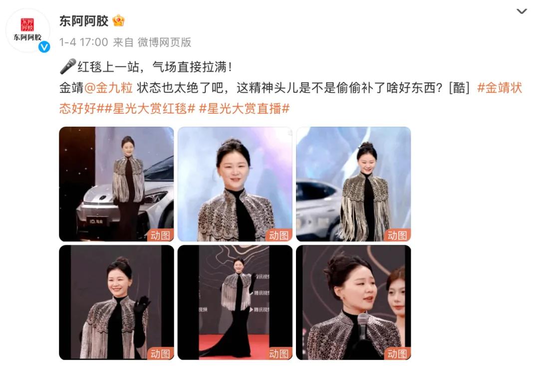 从红毯到后台,从主持人互动到颁奖环节,东阿阿胶在星光大赏现场打造了一个完整的品牌体验闭环。在社交媒体上, #金靖状态好好 等话题引发网友热议,进一步扩大了品牌影响力。这种线上线下联动的营销策略,不仅让品牌深度参与到内容共创中,更在潜移默化间重塑了消费者对传统滋补品牌的认知。