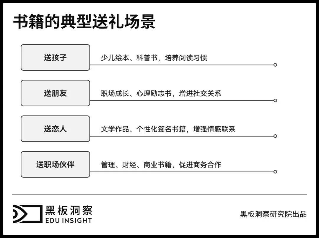 在这一背景下,图书作为承载知识和情感的独特载体,正逐渐在送礼市场中占据重要位置。与传统的食品、红包等消费品相比,书籍的赠送具备更为深远的意义。书籍不仅传递知识和信息,还承载着浓厚的情感价值,因此,它在送礼市场中的独特地位日益凸显。尤其是在送礼的日常化和场景化趋势下,图书逐步从节庆送礼的特殊品类,走向了更为广泛的社交场景,成为一种可以在各类关系中高频使用的礼物。