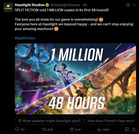 2天卖出100万份,这是《双影奇境》游戏发行商EA与开发商Hazelight工作室宣布的最新成绩,而该工作室前作《双人成行》当初达到这个数字用了将近一个月的时间。