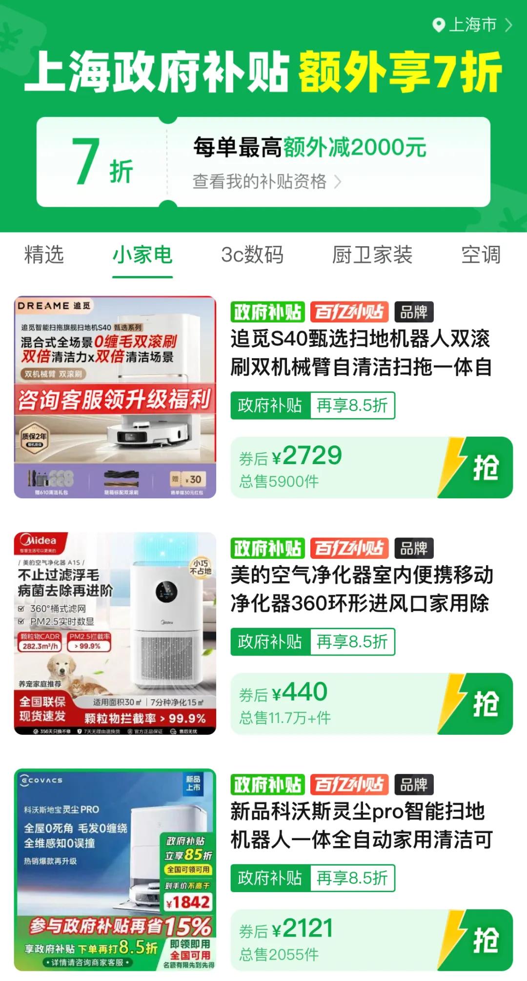 ▲在拼多多“国补”专区,目前上海等地已可在政府补贴外享“折上折”。
