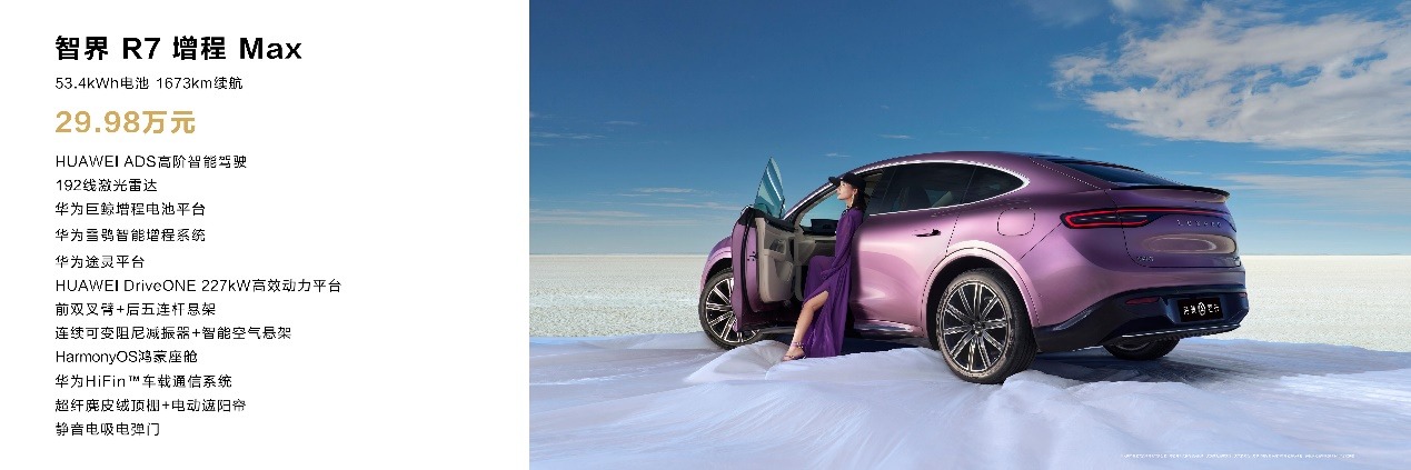 爆款轿跑SUV智界R7推出增程新版本,在华为雪鸮智能增程系统极致静谧与低油耗优势基础上,带来53.4kWh大电池和四驱增程系统,满足用户对更高续航、更强性能的追求。其中,智界R7增程Max CLTC纯电续航达360km,城市纯电使用一周一充;满电满油CLTC综合续航可达1673km,WLTC百公里油耗低至5.68L,行驶里程更长,出行成本更低。智界R7增程Ultra搭载华为DriveONE四驱系统,零百加速仅需4.9秒,配合满血途灵平台拥有82.2km/h麋鹿测试成绩,提供极致操控的爽感和可油可电的便捷。智界R7增程新版本的上市,将进一步强化智界R7在细分市场的竞争力,夯实“油电双强”的车型布局。