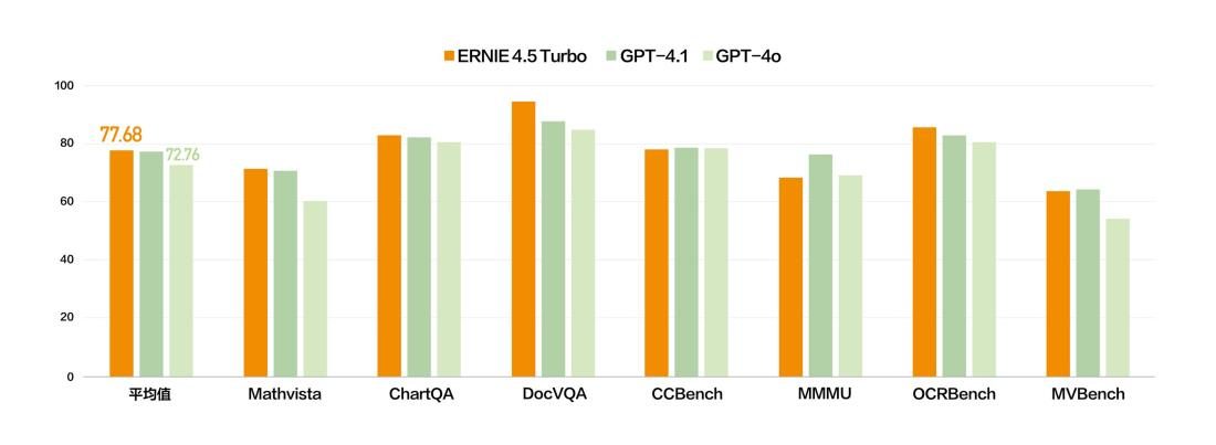 “多模态将成为未来基础模型的标配,纯文本模型的市场会越变越小,多模态模型的市场会越来越大”。基于这样的判断,文心大模型4.5 Turbo和X1 Turbo都进一步增强了多模态能力。在多个基准测试集中,文心4.5 Turbo多模态能力与GPT 4.1持平、优于GPT 4o。