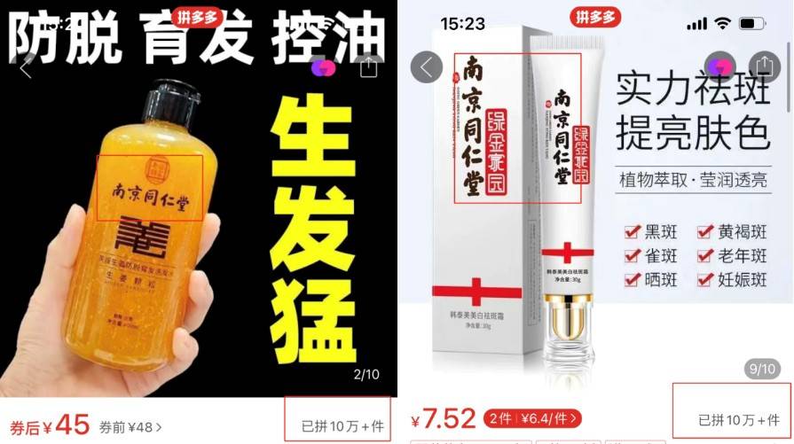 相比白云山,同仁堂有过之无不及。在淘宝搜索“同仁堂化妆品”,除了同仁堂化妆品官方旗舰店外,充斥着大量的北京同仁化妆品店、同仁专柜正品特卖、南京同仁堂品牌百年店等店铺。京东上,输入南京同仁堂关键词后,出现了几十万条搜索结果, 涉及的产品包括面膜、面霜、祛斑霜、维生素E乳霜等多个美妆品类。